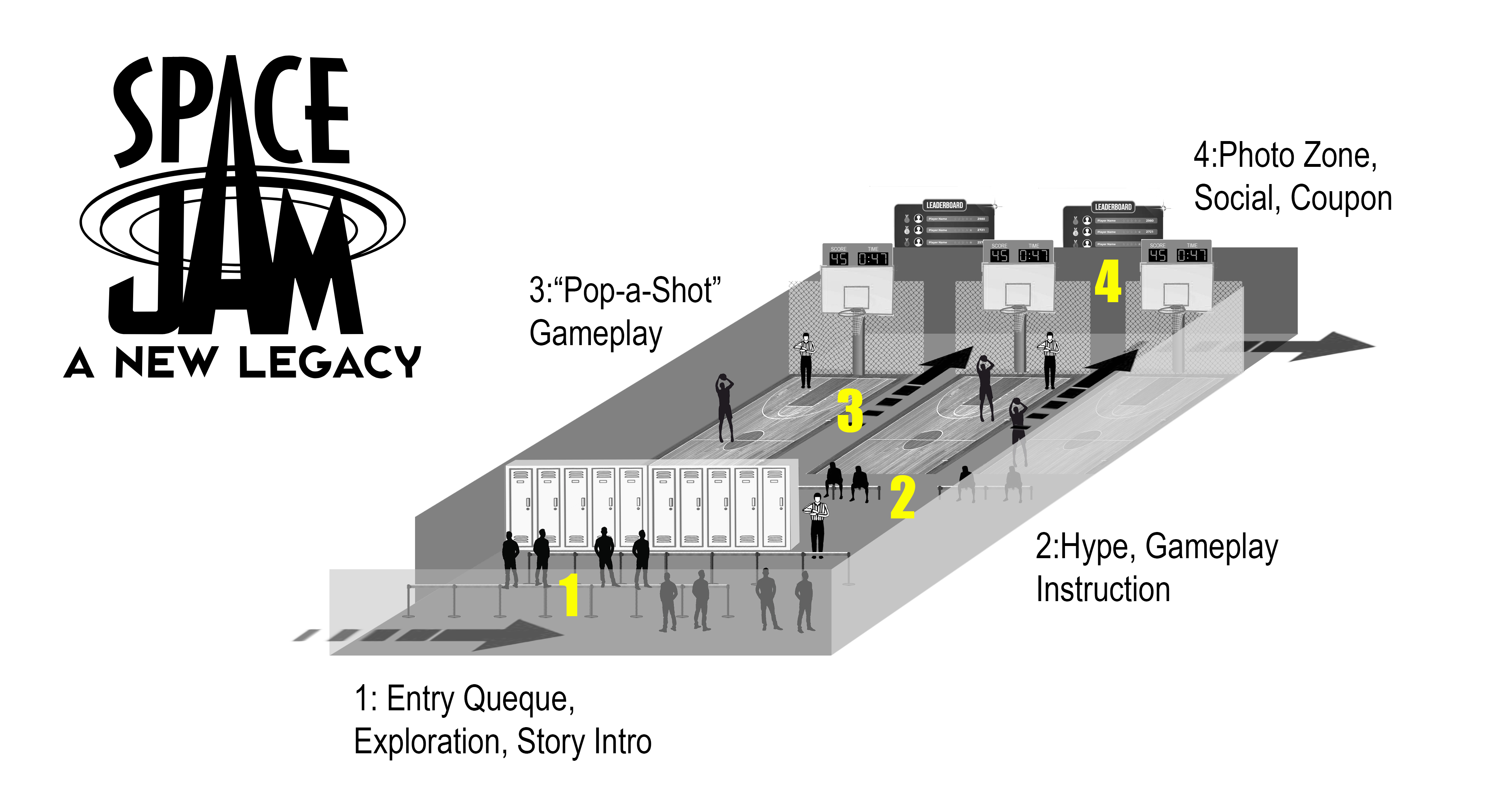 To drum up excitement ahead of Space Jam 2's release, Warner Animation scoped out local hot spots—like Dallas’ AT&T Discovery District—as perfect places to connect with fans. They brought in the team at 900lbs to dream up a cool, hands-on play area that would get people hyped for the film. First on the list: build out a journey map that wove in the movie’s storyline and gave visitors an immersive, fun experience from the moment they walked in.